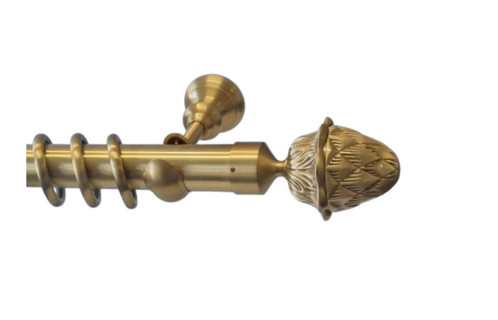 Elegante Gardinenstange aus mattem Messing - 40 mm - Modell Simeon Pinie Verleihen Sie Ihrem Zuhause zeitlose Eleganz mit unserer matten Messing-Gardinenstange, Durchmesser 40 mm, mit kunstvollen Pinienzapfen-Endstücken. Diese exklusive Vorhangstange ist ideal für schwere Vorhänge oder Gardinen geeignet. Ob im Schlafzimmer, Wohnzimmer oder Esszimmer diese Stange wird sich jeder Umgebung exzellent anpassen. Das hochwertige, massive und matte Messingmaterial ist durch eine spezielle Schutzlackierung gegen Anlaufen geschützt. Stilvolles Design ● Elegante Pinienzapfen-Endstücke ● Passt zu verschiedenen Einrichtungsstilen Lieferumfang ● Endstücke Modell Simeon ● 40 mm Rohr glatt ● Stilvolle Halterungen ● Alle Montagematerialien enthalten Zusätzliche Informationen: Gardinenringe sind im Lieferumfang nicht enthalten. Diese können Sie unter der Artikelnummer: SW10379 oder 5448 bestellen. Die Gardinenstange wird mit 2 Trägern für Längen von 1,50 bis 2,00 Metern geliefert, mit 3 Trägern von 2,00 bis 4,00 Metern und mit 4 Trägern über 4,00 Metern. Wir liefern standardmäßig über 200 cm geteilt inkl. Verbinder. Auf Wunsch können Sie alternativ den Speditionsversand in der Bestellung auswählen. Jetzt bestellen und Ihr Zuhause mit dieser einzigartigen Luxus Gardinenstange verschönern!