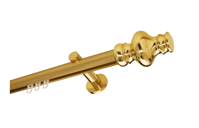 Gardinenstange Messing glanz Innenlaufsystem 28mm Modell - Ferdinand III Classico -Design Juwel Line im Lieferumfang enthalten : - Endstücke Messing glanz massiv Modell Ferdinand III - Innenlaufprofil Aluminium Messing glanz Optik - Halterungen WA ca 8 cm (andere Abstände möglich) - alle Teile aus hochwertigem massiv Messing glanz - Schutz lackiert ( gegen anlaufen ) umfangreiches Zubehör finden Sie im Shop oder auf Anfrage Versand erfolgt am Stück oder geteilt incl Verbinder ab 240 cm Stangenlänge sind 3 Träger im Lieferumfang enthalten ab 440cm sind 4 Wandträger enthalten